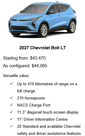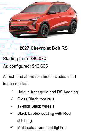 (604) 987-5231"The 2027 Chevrolet Bolt is returning as one of Canada’s most affordable EVs, offering up to 410 km of GM-estimated range. The electric Bolt is back with a bold new design, a spacious, reimagined interior, and enhanced technology throughout. Enjoy up to 2.5x faster DC Fast Charging, large digital displays, with ove 20 standard and available safety and driver features." ***Contact us today to Learn about our $500 EARLY ORDER BONUS!***